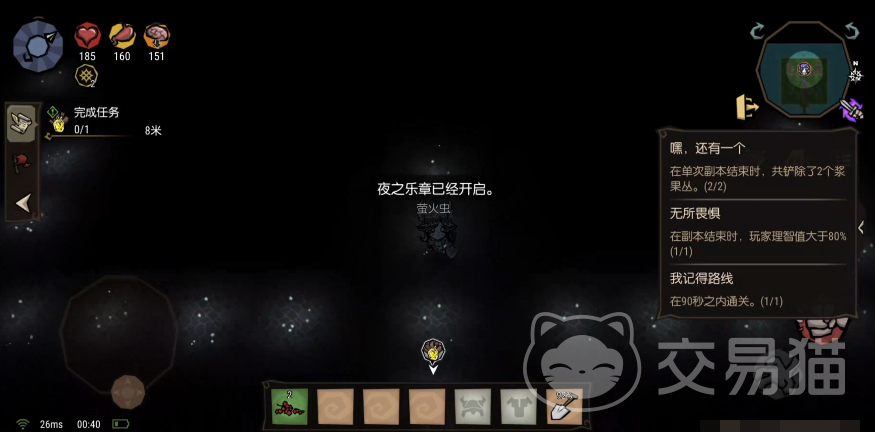 进入关卡后先往上走,路上会有萤火虫照亮你的路,这时先不用担心san值,会看到一个火鸡神龛,这里是一个十字路口,记住神龛的位置在路口的下方。往左走,继续沿着萤火虫的路走会看到一些荧光果可以拾取它们,它们可以提高san值,也可以用来照明,一共需要拾取三个荧光果切记不要全吃掉。那完全部的讲过之后回到十字路口,往下走回到火鸡神龛,把两个浆果丛物品放入神龛,完成任务。