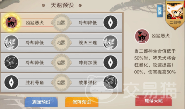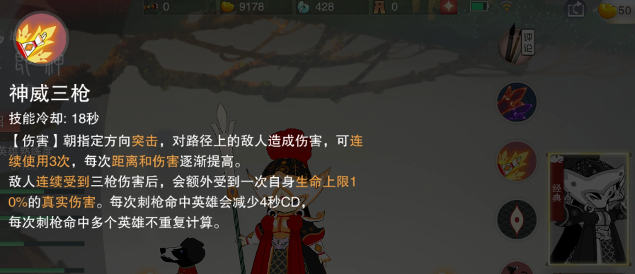 神威三枪:二郎神可以快速向前冲三次,每次都会对敌人造成伤害。如果他能连续三次命中同一个目标,那么那个敌人还会受到额外的重击(hp上线的10%),cd18秒。三技能天眼:打开了全局视野,让二郎神能看到所有隐藏的敌人,并且选择一个目标进行迅猛的冲锋,到敌人身边后会触发大额伤害以及定身。
