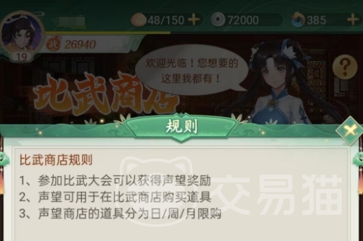 其实声望商店的入口不是通过商人点击进入的,而是需要大家解锁了冒险玩法之后才可以体验的,在大家解锁了冒险历练玩法之后第一个解锁的就是比武大会的玩法,大家是可以通过比武大会的玩法找到声望入口的,这里的比武大会其实就跟很多游戏当中的排行榜玩法一样。