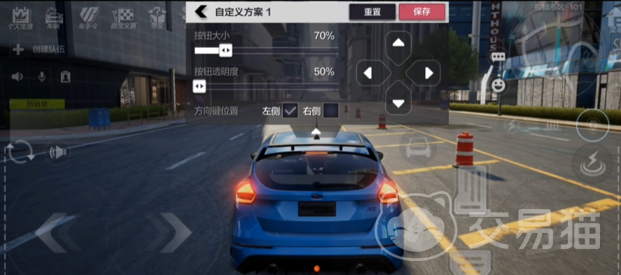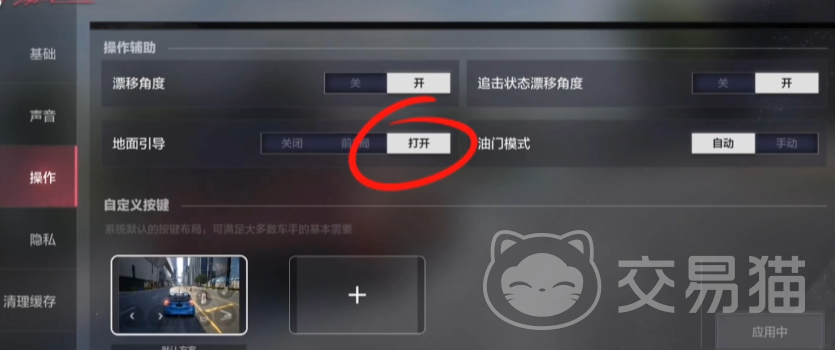 操作设置中将地面引导打开,有注意完善漂移与走线,在大世界中油门手动档还有一个开关,是在地面引导的旁边。然后就是最为重要的自定义按键了。如下图所示,这里是一套对手机用户使用起来非常舒适的,大家可以结合自己的手型以及操作习惯来来做细微的调整,像是按钮大小、透明度这些。这里建议透明度都设置为50%,这样不会挡住你的视线。这套操作按键的特点是将氮气加速放在了脚刹与油门中间。