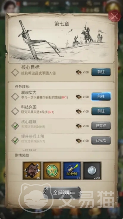 挑选完文明后可根据游戏引导来完成开荒,学会攀升文明科技、出兵征战流寇的方法。要知道,万乘之国的章节任务是前期大量获取资源的途径,尤其是在建筑等级不高、资源产出效率慢的时期,章节奖励是玩家能完成开荒的重要手段,所以尽可能地完成章节任务,才能让玩家更顺利地进行开荒。
