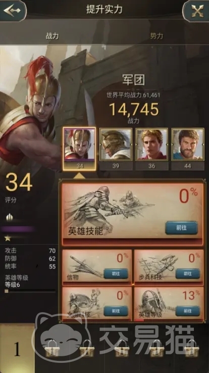 游戏内的养成以英雄和兵种为主,玩家可提升英雄等级并让他装备信物,来让英雄获得相关加成,并通过解锁文明科技中的兵种特性,增强兵种的战力。此外,游戏内所有建筑均有自己的特殊效果,例如医馆可治愈伤员等,所以还请玩家尽量将建筑提升至当前的最高级。