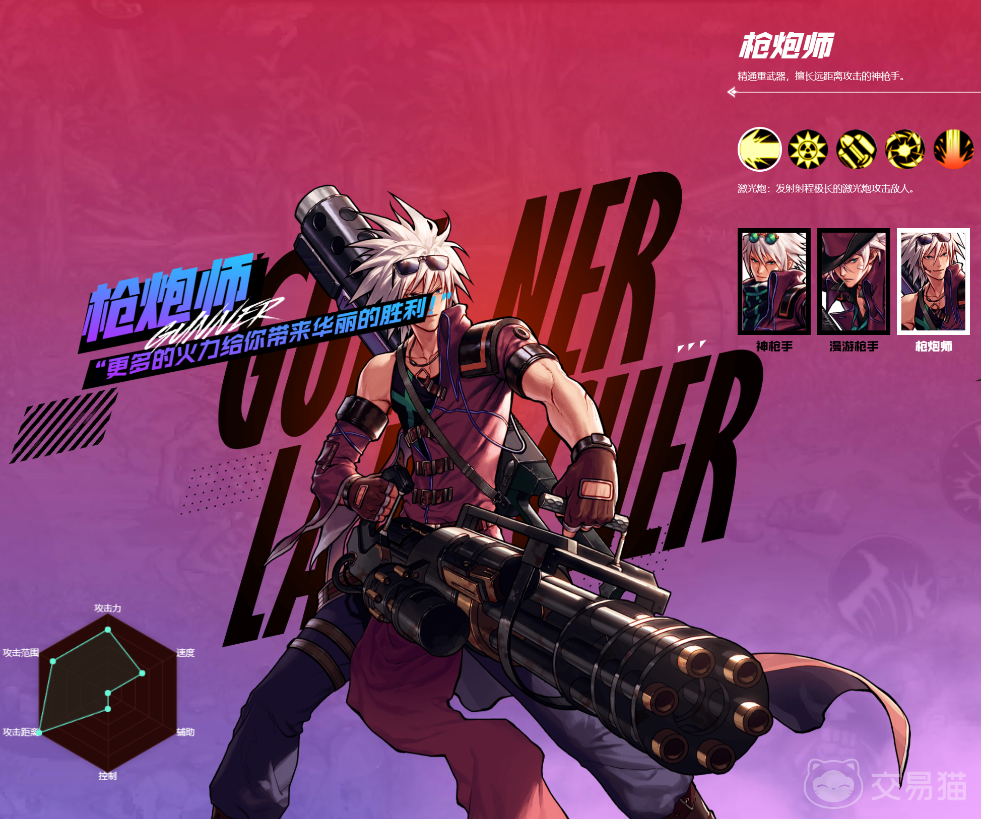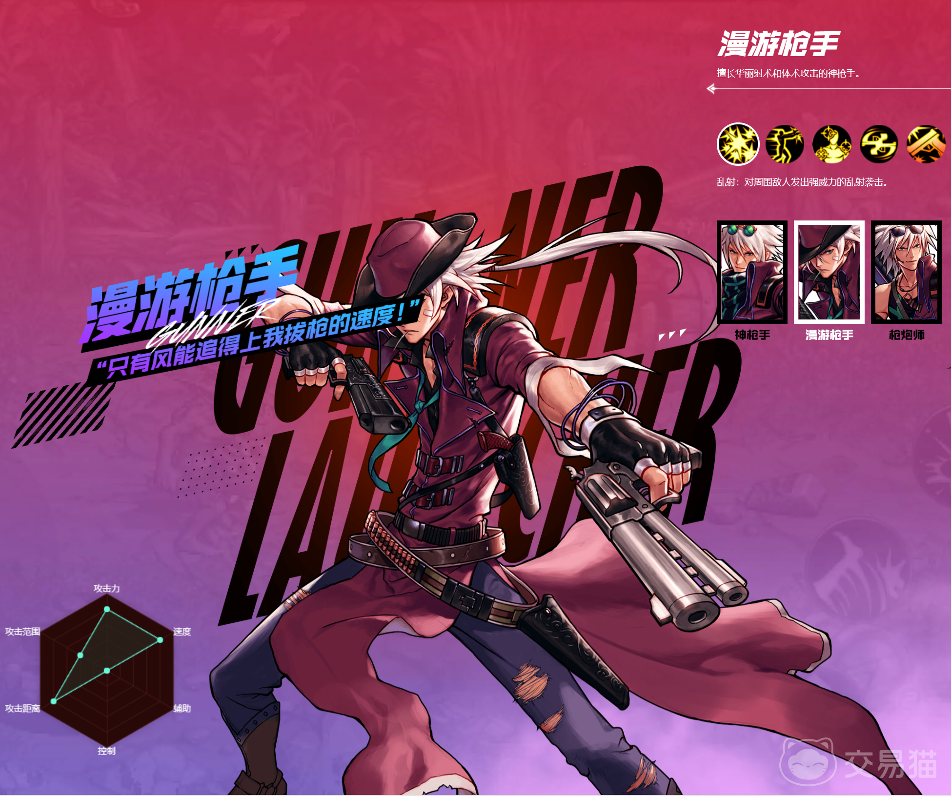 漫游枪手:他的移动速度快,在地上来回摩擦,可以轻松躲避对手的攻击,同时还可以在移动中射击,打出稳定的输出。核心技能回旋踢,可以在空中释放,造成大量的浮空伤害,同时还可以改变自己的方向,打出意想不到的角度。虽然技能十分炫酷,且连招多样,但是伤害比较刮痧容错率低。