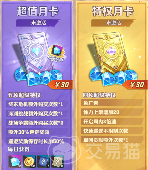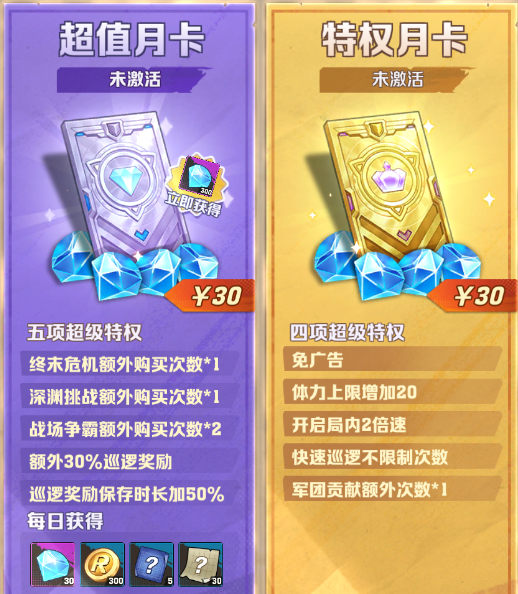 第五个氪金的则是游戏中十分常见的【月卡】了,在这款游戏中,同样是有两个不同的月卡可以选择的;【超值月卡】【特权月卡】,月卡的期限都是30天,而超值月卡的话,每天可以额外获得30个钻石和一些基础材料的获得,同时还可以增加副本的挑战次数,而特权月卡的话,则是增加一些体力上线和2倍巡逻等,大家可以根据氪金的需求来进行选择!