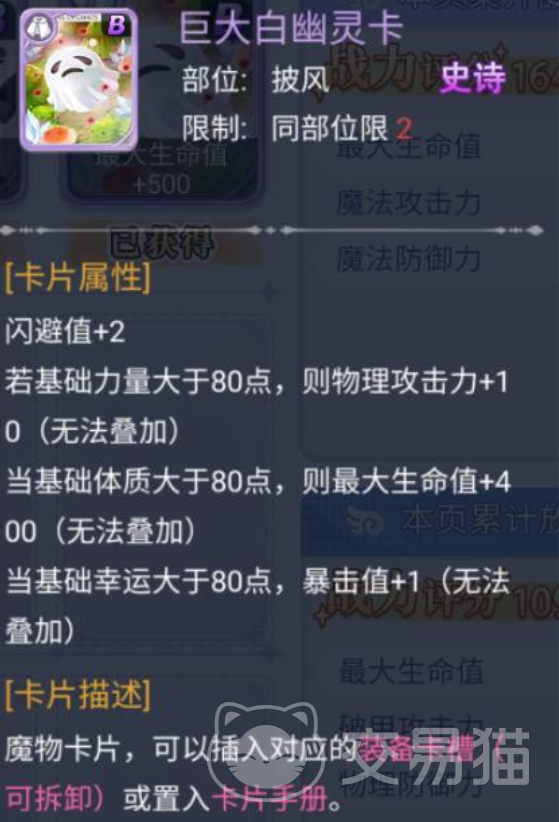 巨大白幽灵卡是一张具有独特效果的卡片,适合那些基础属性已经相当高的玩家。这张卡片提供了多重属性加成,但它们都有一个共同的前提条件:相应的基础属性必须大于80点。如果你的基础力量超过80点,巨大白幽灵卡将增加10点物理攻击力;如果基础体质超过80点,最大生命值将增加400点;而当基础幸运值超过80点时,暴击值将增加1点。此外还提供2点闪避值,这对于需要提高存活率的刺客玩家来说是一个不错的选择。