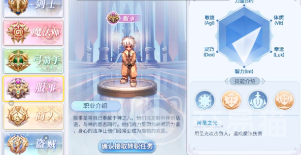 惩戒牧师则是以输出为主的一种,这里主要也是物理伤害,不过自身的防御能力和辅助能力降低了一些,都是用来换攻击力和爆发了。惩戒牧师在一转的时候推荐的技能加点主要是三个方面,分别是天使赐福,加速以及天使之护,二转的话依然是选择钝器,还可以考虑神威以及天使之怒和洒水。