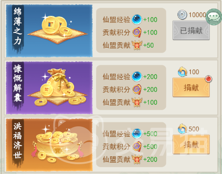 最后一个特别推荐大家使用灵玉的地方,就是【仙盟】玩法了,这个仙盟玩法十分的特殊,大家可以在捐献玩法中,选择600灵玉来进行捐献,可以获得大量的材料和抽奖券,算是一个比较划算的兑换了!