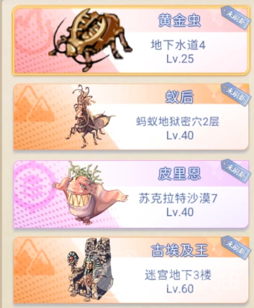 MVP的怪物有很多,接下来我们便为大家介绍几个询问较多的MVP敌人。黄金虫是玩家们初期所遇到的第一个MVP敌人,它基本上只会在下水道的4F出现。黄金虫的等级虽然只有25级。但是其本身的闪避是非常高的。玩家们在挑战的时候需要确定自身的准确率够不够,如果不够的话尽量叫上队员去挑战。黄金虫会使用金钱攻击,暴击,隐匿,召唤小弟,火箭术,治疗等技能。因为其属性为火,我们可以携带水灵装备或者使用水系的魔法较好。