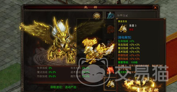另外还需要了解,在游戏中有许多强力的坐骑,而这些强力的坐骑都可以通过活动产出,分别是炎天火龙,黄金圣龙,海神战鲨,仙灵独角兽,地狱双头犬,这些都是比较强势的,每一个坐骑的实力都很出色,能有效满足多方面的需求。