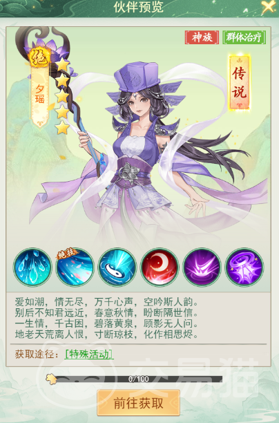 反观【夕瑶】,夕瑶的获取难度是游戏中比较特殊的存在,游戏中通常会举行一些特殊的活动,大家只能在【特殊活动】玩法中,来获得夕瑶,而游戏中是存在升星玩法的,夕瑶和李忆如都属于五星绝品伙伴,可以通过升星玩法,来强化到十星,星级越高,那么自身的属性收益肯定就会更高,所以大家要按照自己的需求来进行选择性的搭配和养成!