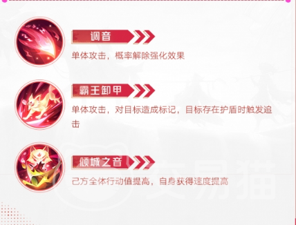 在游戏当中只要玉面狐狸出现,就能直接为己方团队带来无限希望和可能。除了这个技能之外,它的调音和霸王御甲都非常不错,都能触发追击,强化效果,它的倾城之音可以让队友的全体行动值提高,也可以让自身的速度提高。这是一款人手必备的角色,可以一直养下去。在装备推荐这方面,建议各位可以使用速度套4和高速副词条2,装备鞋绝对要速度主词条,其他部位选择副词条就可以了。