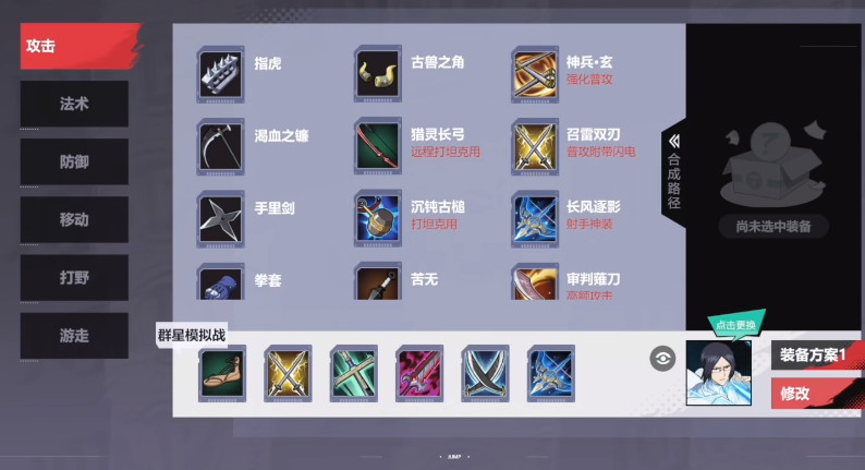 虽然每一个角色在游戏中已经有相应的类别区分,但是因为这是一个需要玩家操控角色对战的游戏,所以在这个游戏中,每一个角色还可以装配六种不同的技能和装备,玩家可以根据自己的喜好在攻击、法术、移动、防御,打野和游走中挑选几个装备配备的角色上,这样在战斗开始之后,人物就可以直接应用这些技能,有了装备的加持,也可以让角色有更强的战斗力。