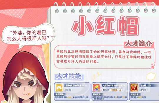 在游戏中是一个拥有着较高伤害的强力角色,而且这个角色还会拥有自我增幅的技能。在游戏的一开始,这绝对是一个高水准的存在,要是能够获得这一个角色,在后期成长之路上也会变得比较简单。进入到游戏的后期还可以继续的培养,比如在一些主流的阵容中都可以使用小红帽能够有效当成一个副C还是非常不错的。