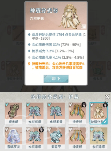 除了心法之外,护具也是需要玩家合理配置的,这个角色是一个擅长近战的角色,所以在挑选护具的时候,要选择带有强防御能力的,就比如神耀分光衫,在战斗的过程中能够提高攻击,并且有很强的防御能力,如果在穿戴这个护具的过程中,受到对方攻击,还可以触发目盲状态,玩家有机会在这个时候及时进行反击。