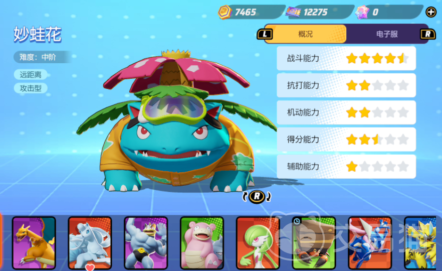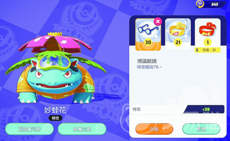 妙蛙花应该是大家都非常熟悉的一个宠物,这个宠物是一只蓝色的青蛙,背上有红色的硕大花朵,这个宠物偏向于攻击型,所以可以进行远距离的攻击,如果选择持有物的话,那可以使用博识眼镜,讲究眼镜,还有能量增幅器,博识眼镜在游戏中的作用就是能够提升玩家的攻击专注能力,讲究眼镜可以提升伤害,能量增幅器也是能够增加伤害的一个持有物。