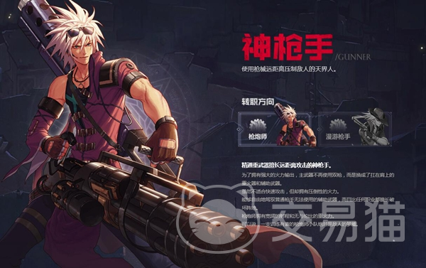 该职业比较擅长使用枪械作为武器来进行战斗,在近距离作战的时候也有一些脚踢的技能可以使用,不过总体来说更加擅长的还是远距离额的输出,因为枪械要经常使用,所以双手的速度对于他们来说至关重要,那么很厚的护甲就不是很适合他们了。对于神枪手来说有两个转职也是非常好的选择,第一个是成为枪炮师,第二个是成为漫游枪手。
