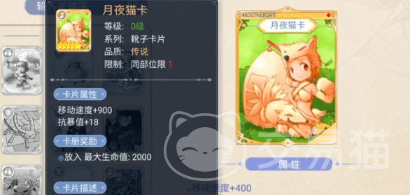 月夜猫卡虽然不是加攻速的,但是很适合以攻速为主的职业使用,它会提高大家的移动速度,并且还有一点额外的暴击数值加成,很利于那些伤害高的角色瞬间的移动进行进攻,或者是躲避敌人的攻击。