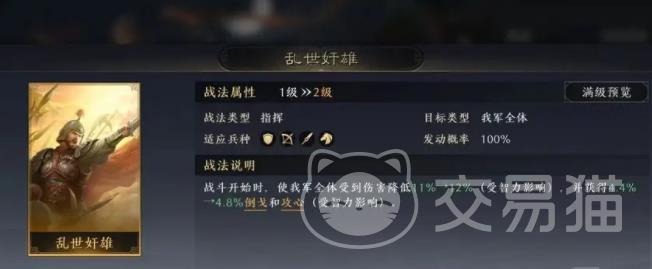 在战法乱世奸雄上面是可以作为指挥型战法用的,可以给己方全体的承运带来百分百的发动概率,这个时候己方受到的伤害不仅会降低,而且还会获取加成,这里的加成是包括倒戈以及攻心方面的数值,但是不管是减伤还是在增益上面都是在智力属性越高的时候效果越好。