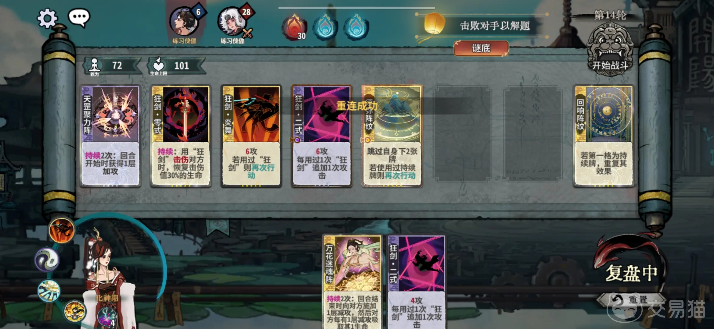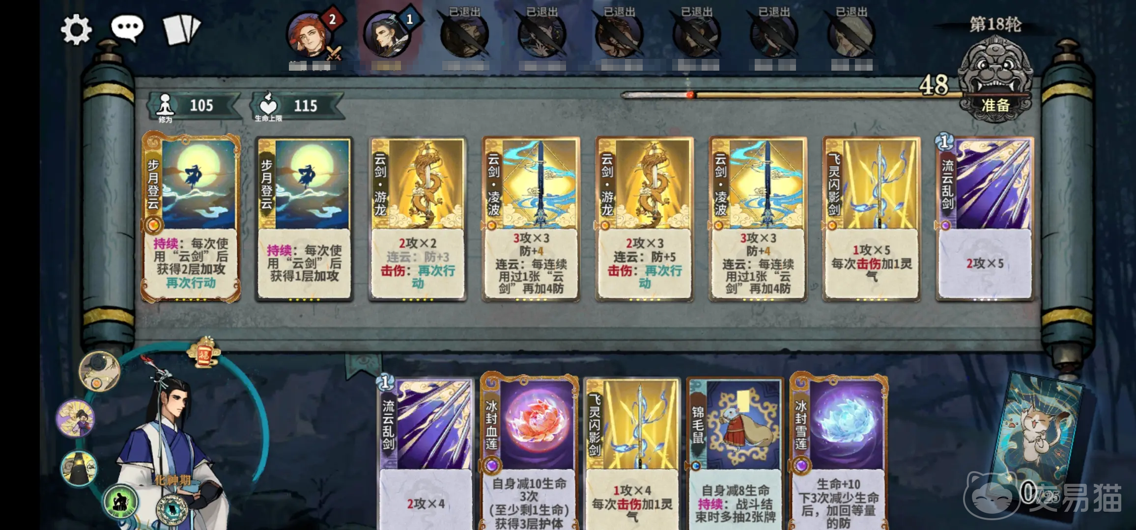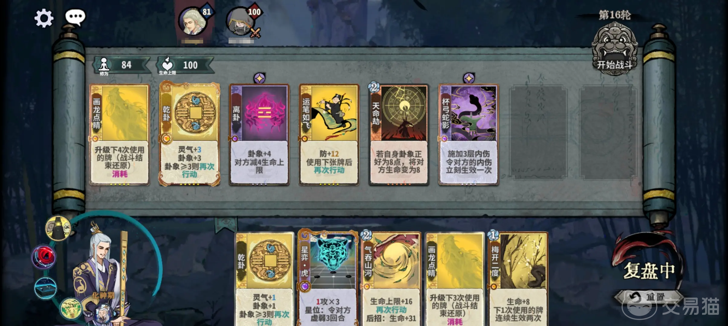 血量也是大家需要注意的,每一回合当中大家都可以得到2点血量,而修为提升的情况下,还能够将血量的上限提升;角色是大家可以自由选取的,因为卡池是独立存在的,同时不同的角色天赋和门派都是不一样的,角色除了主要的职业之外,还有附属职业可以选择,副职业的选择同样是自由的;机缘和秘术可以理解成战斗当中的变数,是一种比较随机的东西,这样让对局的可能性更加的多样化;道韵的设定,这是在对局第四回合的时候可以有的,主要效果就是可以预定一张卡牌。