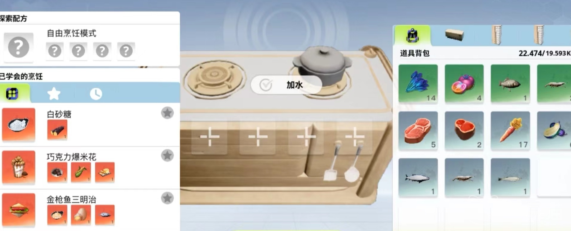 游戏中的食物材料还是非常丰富的,在野外转一圈就能够找到很多,包括水果,菌类,肉类,面点等都有供应。在初期阶段接触最多的应该是蘑菇菌类食材,以及随处可见的动物,都能拿来进行烹饪。在获取肉类方面,只要击倒动物就可以获得肉,无论是羊、犀牛等动物的食用价值都很高,获取的这些材料都是生的,需要烹饪为熟制品才能够食用。