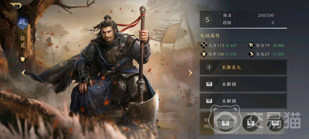 2、基础属性:初始属性武力75成长1.35,统帅102成长2.35,智力72成长1.53,先攻42成长0.47。