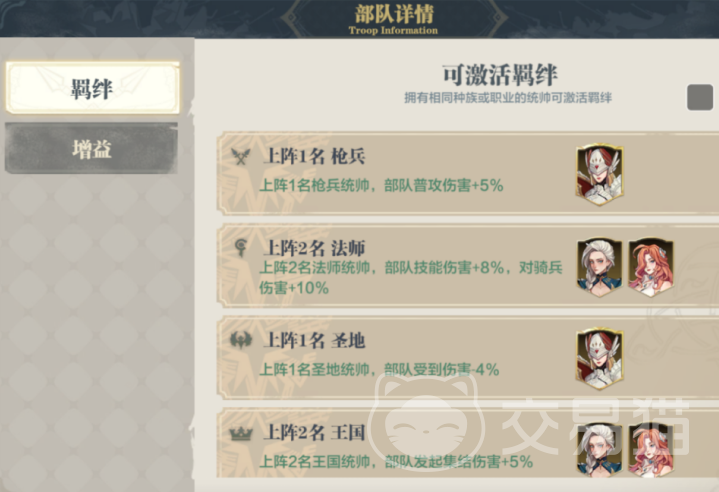 使用该阵容之后,就能够获得四个阵营的羁绊。一枪兵则可增加普通输出,三法师则可触发二法师羁绊,增加所有人的技能伤害,并对骑兵的伤害更高。还可触发一圣地的羁绊,减少部队所受到的伤害。另外还可触发双王国的羁绊,可以增加部队集结伤害。