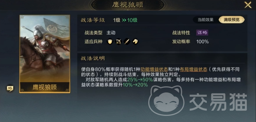 2、战法—鹰视狼顾:使自身有80%概率随机获得一种功能增益状态,以及一种布局增益状态(该效果会优先获得不同的状态),效果能持续到战斗结束,同时每种效果独立判定。伤害效果为对敌军随机两人造成50%谋略伤害,每多持有一种功能增益和布局增益状态,谋略系数提升20%。能提供的增益状态未清醒、精准、抵御,以及五种布局增益有。