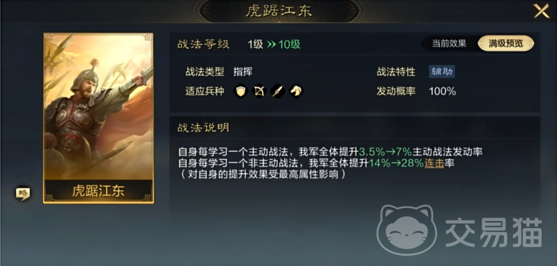 2、战法效果:虎踞江东指挥类型技能,自身每学习一个主动战法,我至全体提升3.5%一7%主动战法发动率。自身每学习一个非主动战法,我军全体提升14%→28%连击率(对自身的提升效果受最高属性影响)。