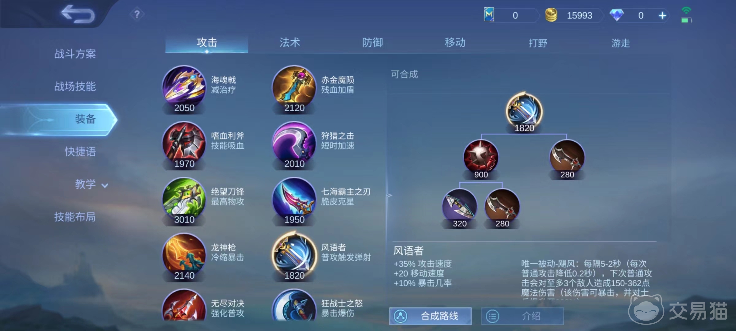 在出装的时候,迅捷皮靴当然是不可缺少的首选,既可以提高移动速度,又能增加攻速。第二件装备推荐选择风语者,大幅度提高攻击速度,移动速度以及暴击几率,都是射手非常需要的。另外还带有唯一被动飓风效果,飓风效果是每隔一段时间就可以使下一次普通攻击造成额外魔法伤害和攻击目标,在每次释放飓风之后会提高移动速度。移动速度的加成能够缓解自身生存能力脆弱的问题,也能帮助走走位到最合适的攻击位置。