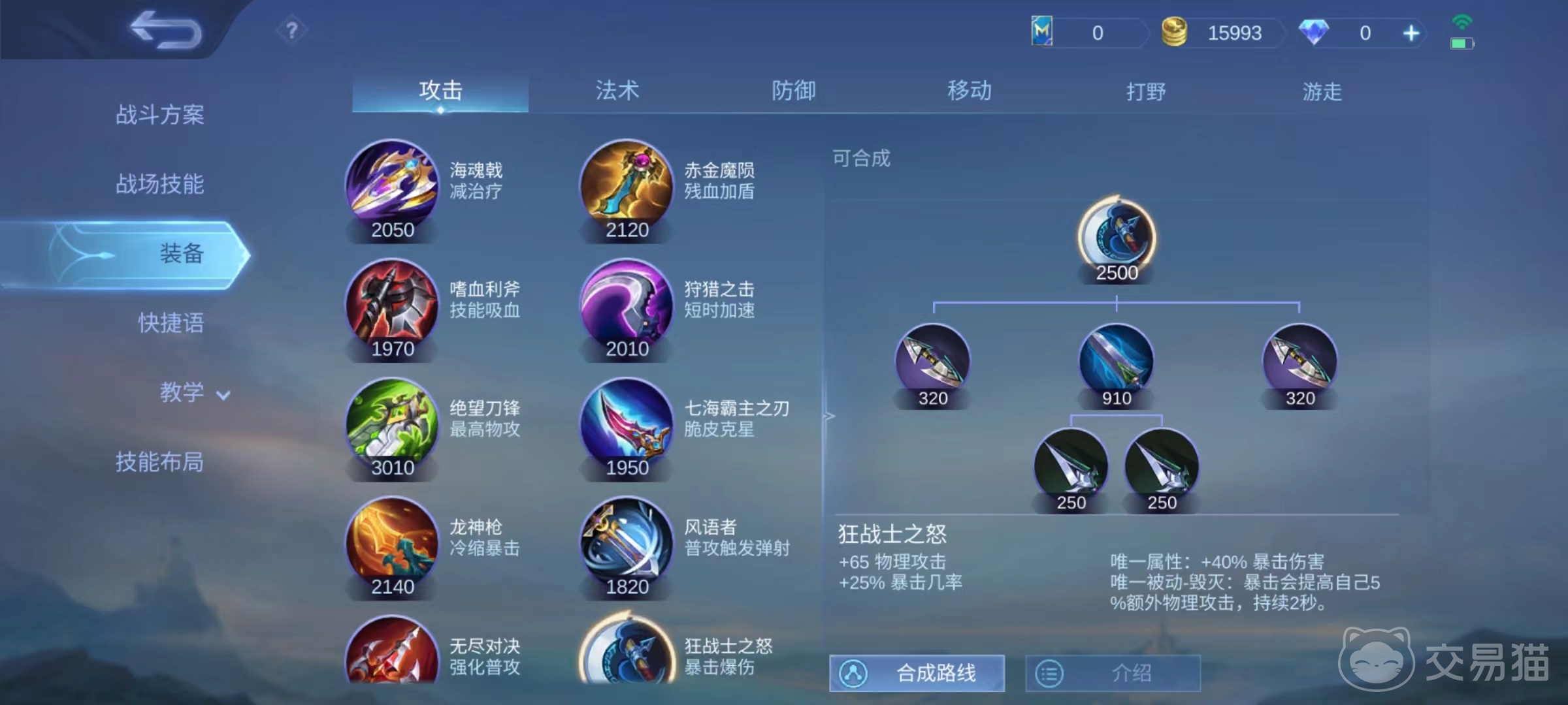 第三件选择哈斯肯的血爪,提高物理攻击攻击速度和暴击几率,在性价比方面和风语者非常相似,自身携带的特殊效果为提高普攻吸血以及触发暴击时提高自身攻击速度,是攻速类英雄的理想选择,提高的吸血也能够帮助续航,减少回家的次数。第四件推荐狂战士之怒,这是物理输出英雄的绝对神器,增加了多达65点物理攻击和25%暴击几率。暴击在后期搭配上攻速是非常完美的输出选择,另外唯一属性还提高了暴击伤害以及触发暴击后提高额外物理攻击力的效果,和哈斯肯的血爪能够完美搭配起来。