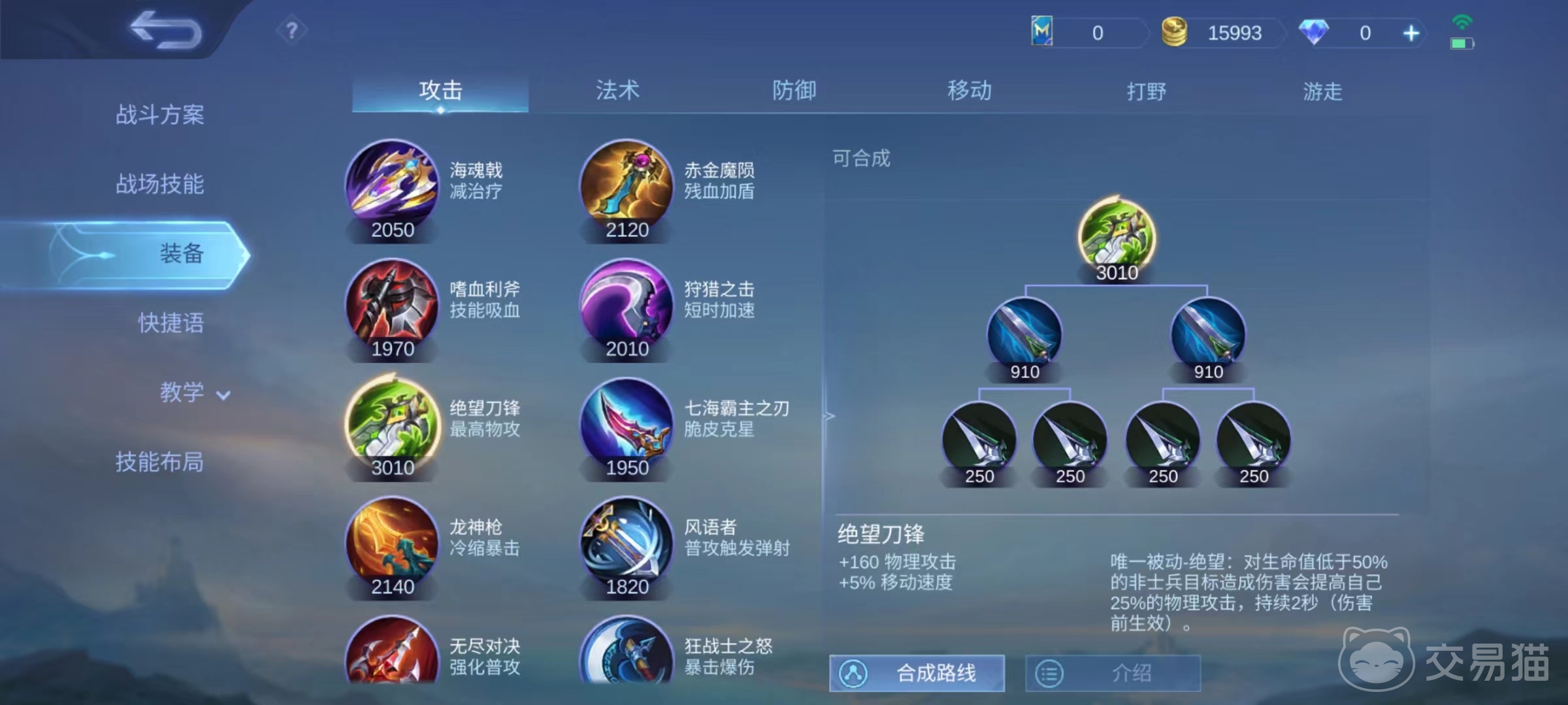 第五件选择绝望刀锋,在大后期有了足够的攻速和暴击之后,物理攻击也是不可缺少的方面。绝望刀锋能够增加160点物理攻击,让整个输出再提高一个档次,还有被动效果在攻击半血以下的敌方单位时,能够提高自身物理攻击,这样对莫斯卡夫的收割能力也是很好的加强。最后一件可以选择龙神枪,所增加的属性都是射手所需要的,还可以提高释放大招后自身的移动速度。