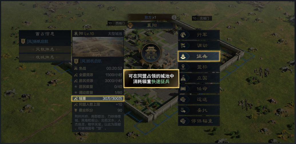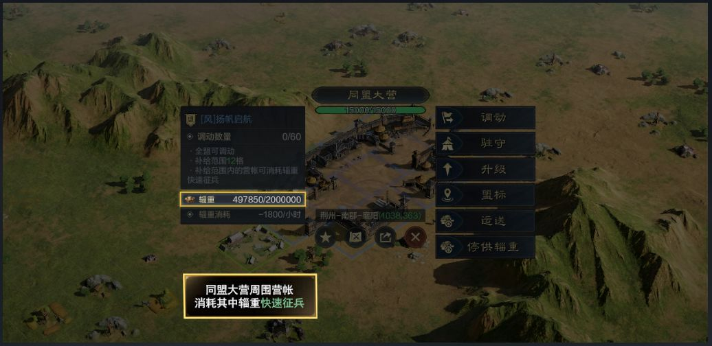 1、不仅能够在联盟领地内快捷召兵外,联盟大营四周的营帐内同样能够迅速征兵。但是需要注意的一点是,营帐也一定要在联盟大营的供给范围之内,才可以使用辎重完成征兵,在营帐内迅速征兵先行使用的是联盟大营的辎重,没有就可以使用营帐所在地的领地的辎重,当然,前提是所在地的领地要被我方联盟攻占。