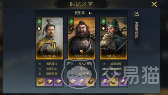关于张飞在配装方面的思路,当然还是要与刘备和关羽搭配在一起,这也是桃园三结义的阵容,通过这三个人在一起可对敌人造成很大的威慑力以及伤害力。其中的张飞的万人之敌以及关于的威震华夏,都是比较厉害的战法。