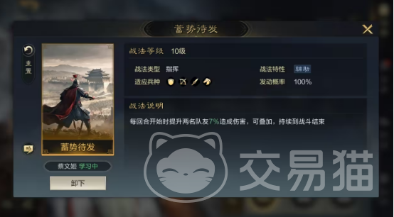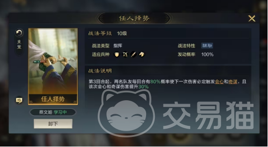 首先在战法自选时有两个搭配起来的效果非常出色,分别是任人择势以及蓄势待发,其中的蓄势待发,会通过每回叠加两个队友百分比伤害。而任人择势战法主要就是可在第三回合时,使自己的两名队友攻击触发会心以及奇谋,增加对敌人的伤害,所以两种战法搭配在一起,真的是特别恐怖的。