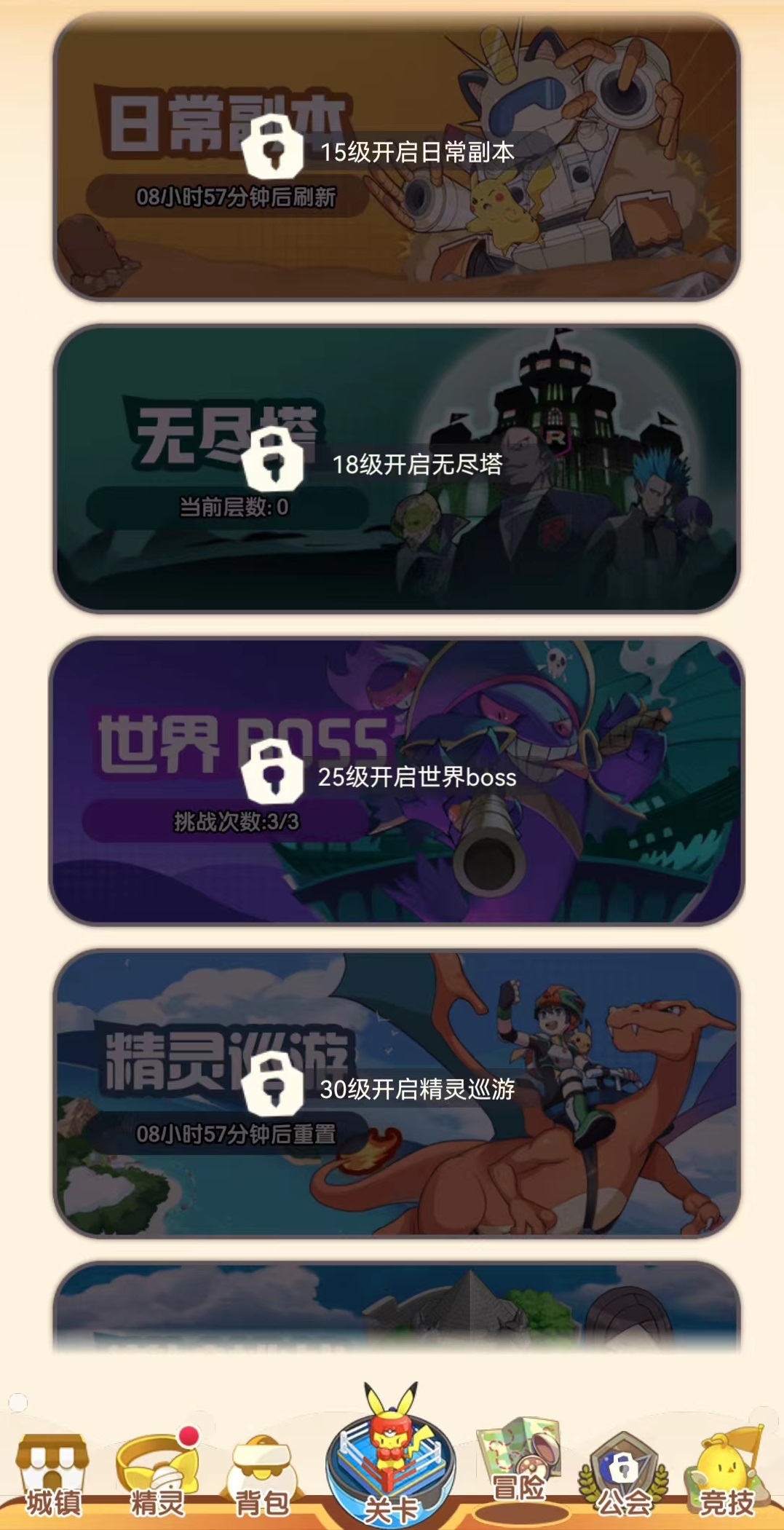 游戏中的主要玩法和大多数同类游戏相似,玩家需要做的是抽取大量小精灵,然后进行养成,进而不断往前推进主线关卡。期间还穿插了很多其他的玩法,都在城镇中可以直接找到,包括冒险功能里的日常副本,无尽塔,世界boss,精灵巡游等,每款玩法都有自己的特色。最基础的依然是对小精灵进行养成,小精灵现在可以直接穿戴装备,可以进行进化。在进化方面也很有宝可梦的特点,在进化之后不仅实力大幅度提高,外形也会有明显变化,在这些精灵外形设计方面做得非常精致,真实展现了大家儿时心中的经典形象。