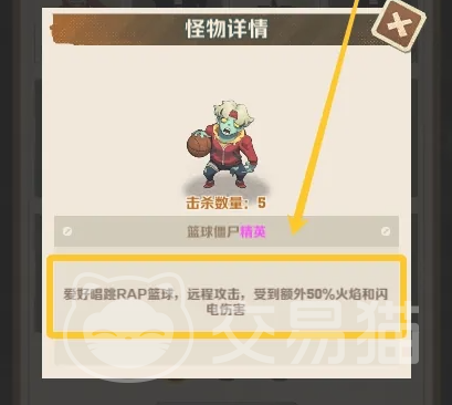 同时玩家们还可以点击研究所内,点击精英的标签也可以查看精英怪物的弱点,每一个精英怪的攻击弱点都不一样,如篮球僵尸精英就是会受到额外50%的火焰伤害,这时小伙伴们就可以使用火系的技能进行针对,使得精英怪更容易被打败。