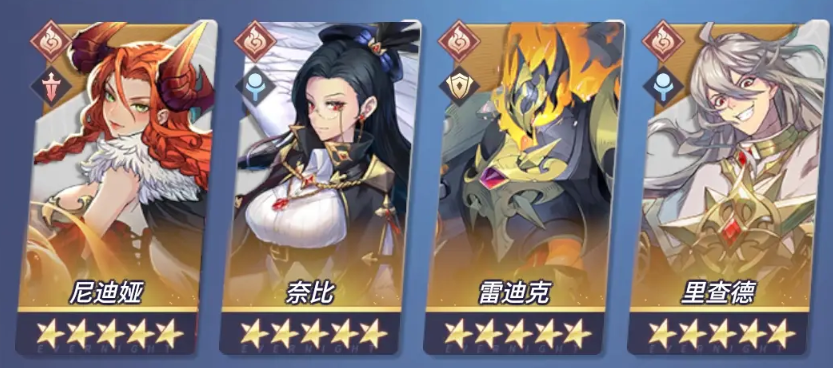 里查德,小技能损害自身15%的血量来获得25%的攻击加成,并对前排敌人造成伤害概率附加灼烧,大招全体伤害与灼烧并且有概率眩晕目标,大招则是在死亡的时候对全体造成伤害概率附加灼烧同时为己方所有单位加攻击。
