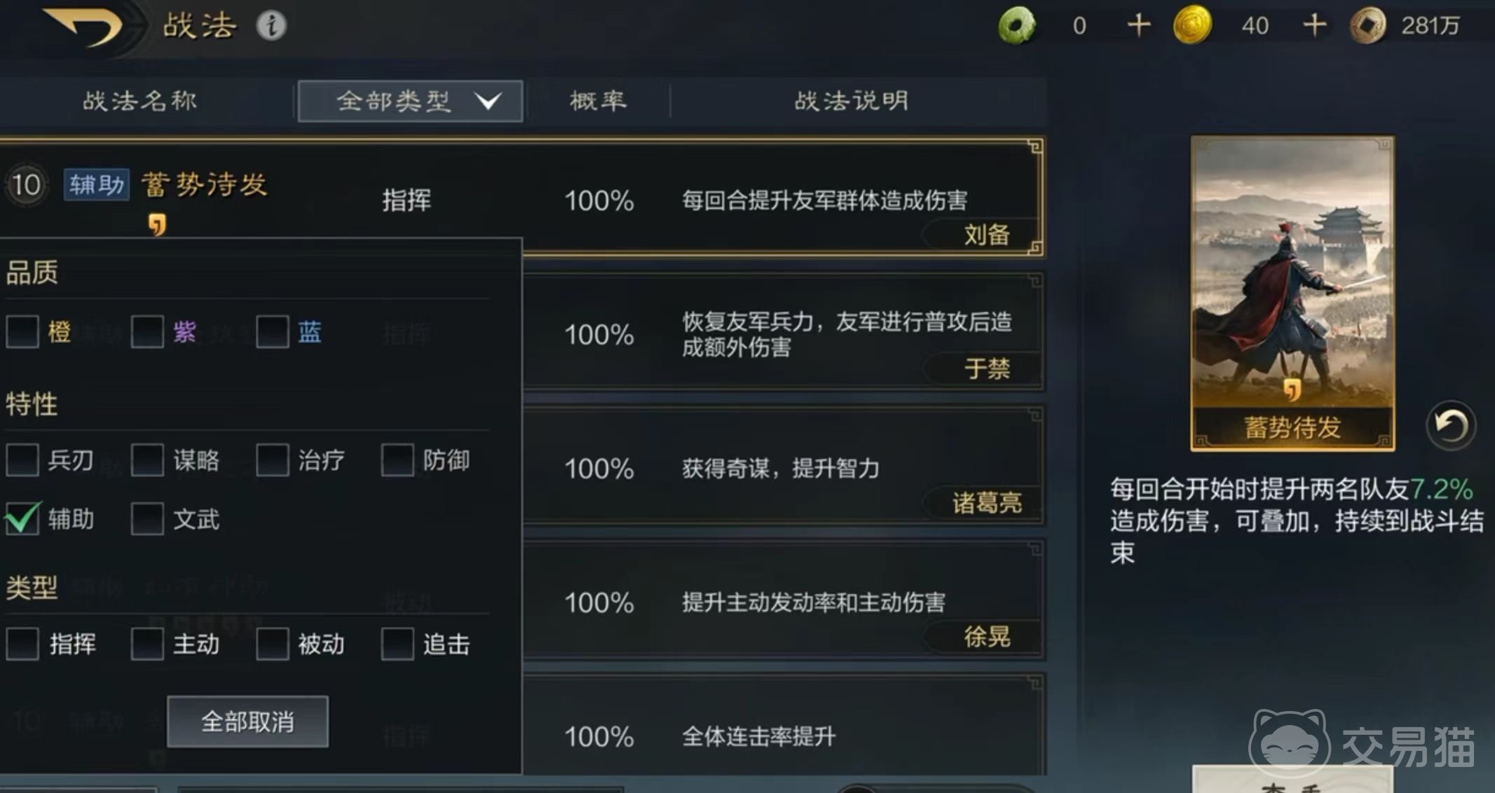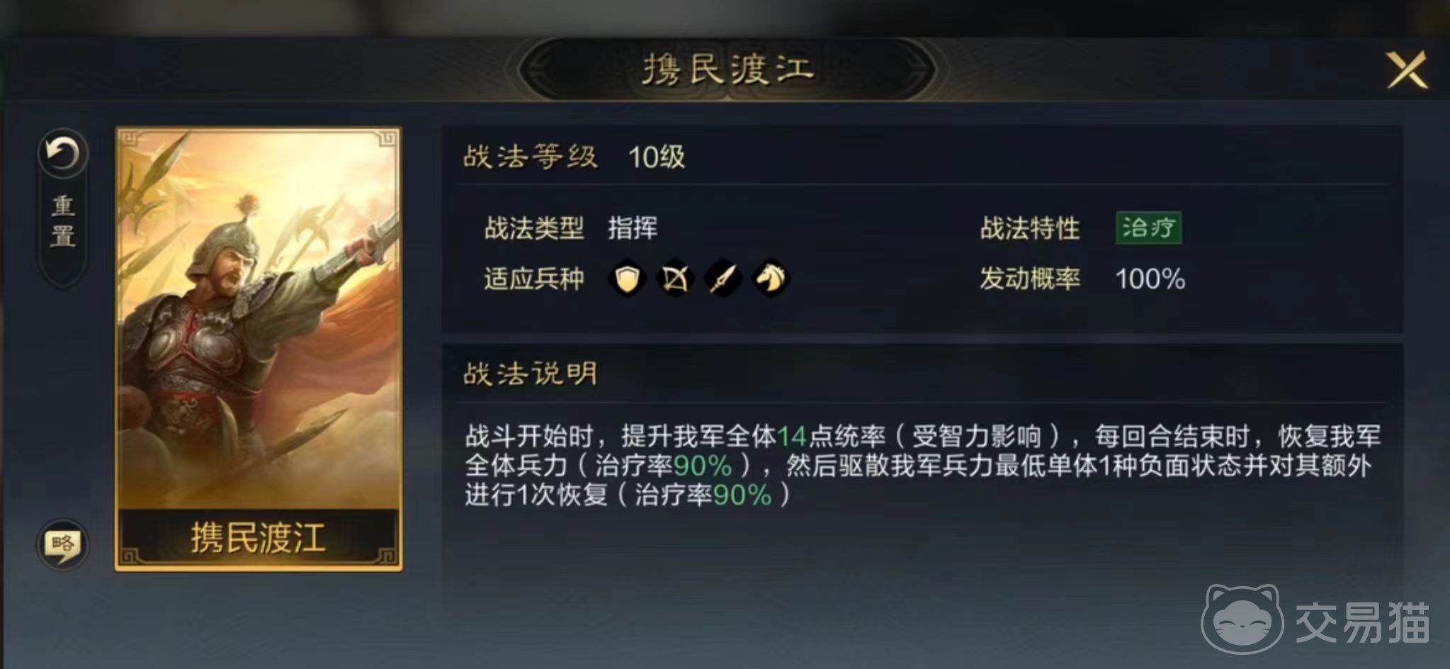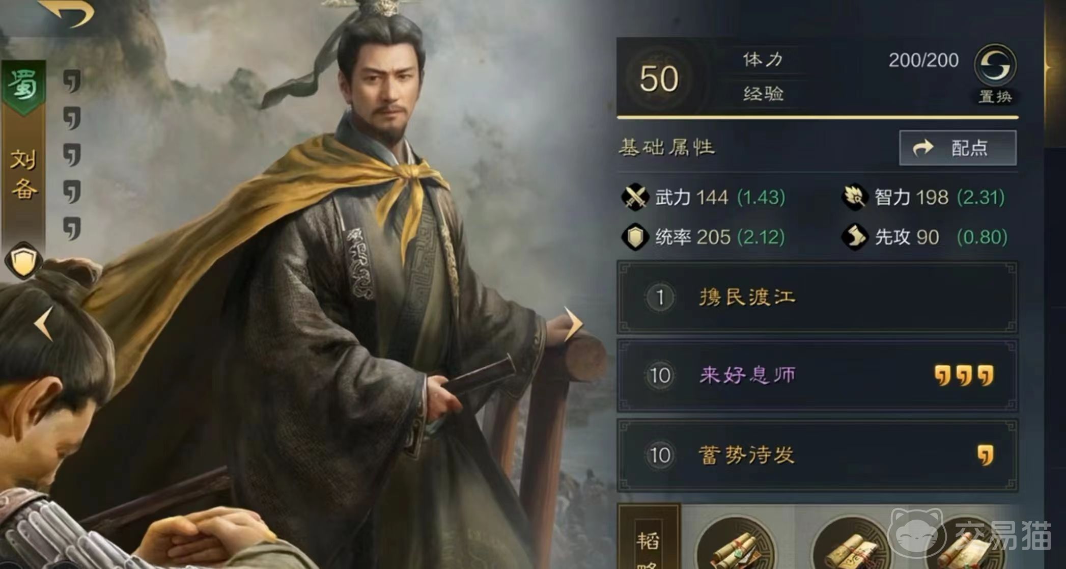刘备的典型战法就是“携民渡江”,这一经典战法也是由历史典故而来的,这个战法可以在准备回合阶段就进行生效,即使有控制效果也不会受到影响,可以提升我方军队三个单位的统帅率。