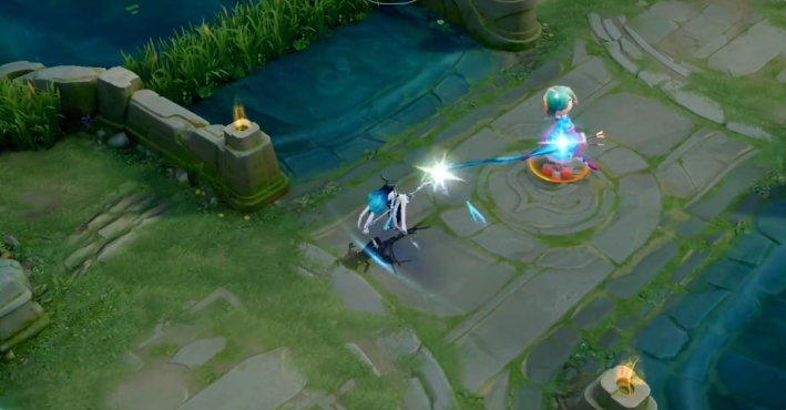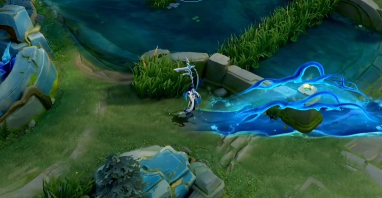 一技能是使用自己的法杖划出一条河道,然后角色可以在河道上加速漂浮过去,将末端的法杖捡起来之后进入神巫状态,这时候可以无视地图中的任何地形,随意的进行穿梭,也就是说这个技能可以随便穿墙,而且该技能的距离非常的远,穿过厚墙体的时候还有掩体的效果。