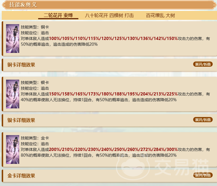 罗宾——【二轮花开束缚】单体伤害,会造成追击伤害,并且有一定概率让敌方无法换位。【八十轮花开】单体伤害,可以对目标单位叠加伤害上升效果,持续两回合。【百花缭乱】单体伤害,将目标击退到后排,如果敌方没有后排则恢复一定的奥义值。