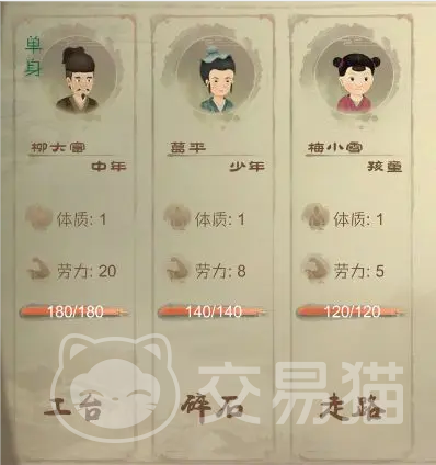 开局进入游戏后,玩家将会来到一处幽静的山谷中,开局玩家手中将会有3个角色,分别为两男一女,柳大福,葛平,梅小雪,这三人的体力和能力也是不一样的,柳大福作为一名中年男人劳动力和体力都是最好的,葛平和梅小雪是少年和孩童,体力值相对较弱,但是玩家可以进行培养。