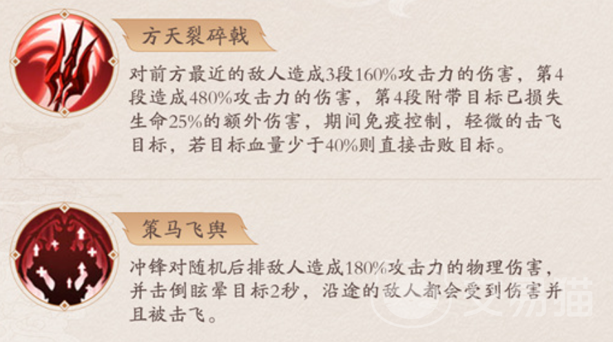 开始挑战之前,大家日常所使用的核心输出需要更换为吕布,其中的一个原因就是利用吕布的方天裂碎戟针对敌人的前排进行多段攻击,可以有效突破对方的前排,降低敌人的综合防御能力。并且,对手的生命值要是低于40%的话,还会直接被吕布秒杀掉。但是,针对前排的杀伤,只不过是吕布的优势之一。