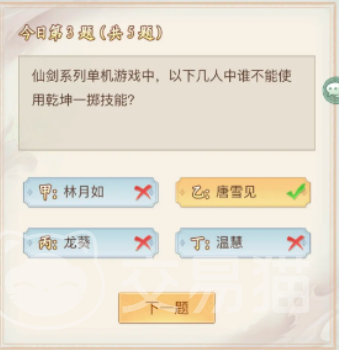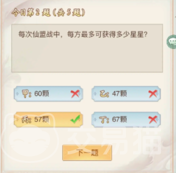 然后是第二个问题,在仙盟战中每方最多可获得多少颗星星,该问题的答案是57颗,这是游戏内的一个玩法引出的问题,和前作没有关系。在之后是第三个问题,在仙剑系列单机游戏中一下哪位角色不能使用乾坤一掷技能。