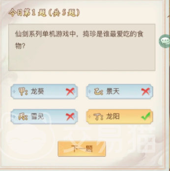 首先要带大家看的是第一个问题,仙剑系列单机游戏中捣珍是谁最爱吃的食物,这问题的答案是龙阳,在前作中最喜欢吃该食物的角色是龙阳,这个问题相信只要是玩过仙剑系列的玩家都知道。