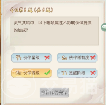 该问题的答案是冰冻弓,这个问题还是比较简单的,毕竟从名字上来看也只会选冰冻弓。最后一个问题灵气共鸣中,以下哪项属性不影响伙伴提供的加成,该问题的答案是伙伴等级,除了伙伴等级外,其他属性均受影响。