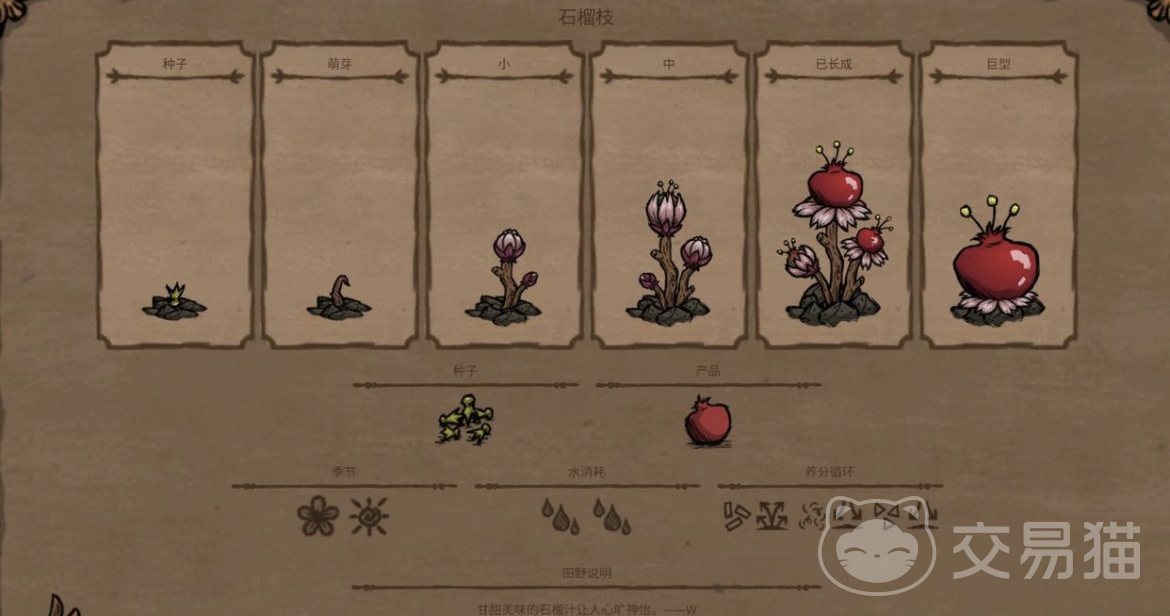 第6种植物石榴,它的种植周期很长,但是它的果实很好吃,能帮助你快速补充你的体力,因为它的糖分很高,可以用来榨一些石榴汁,或者直接食用也可以。