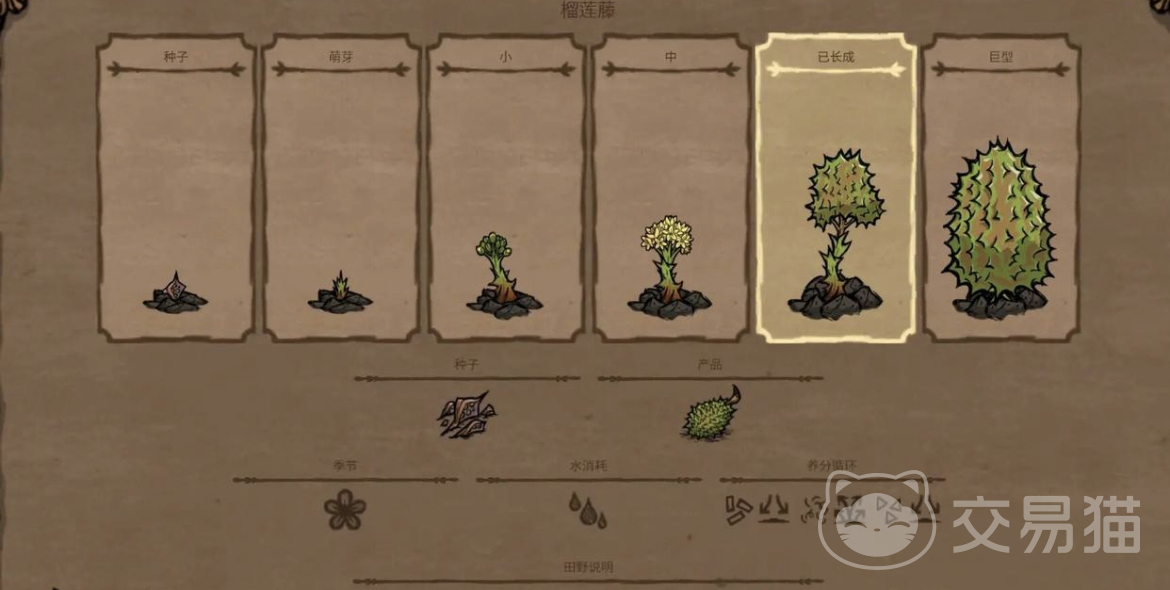 第5种榴莲,榴莲的作用可以帮助你生产荆棘,因为它的果肉可以食用,它的壳可以用来保护你建造篱笆,能让房屋的防御力变强,而且榴莲树的树枝非常的庞大,十分粗壮,能直接利用它的树枝作为支架。