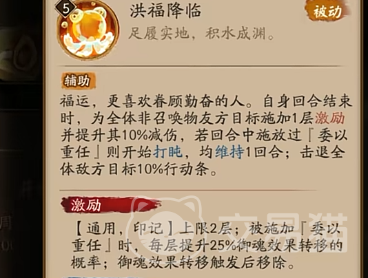 释放大招后,还会给攻击力最高的队友,提供一个【激励】效果!这个效果小编在实战中查看过了,如果角色的激励效果层数不叠满的话,可能就会导致大招在转移的时候,出现失败的情况,是一个比较适合pvp作战的式神!