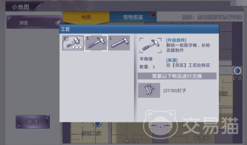 首先需要前往游戏中的“郊区”地图。在这里,会发现几个关键的NPC,包括裁缝、铁匠和工匠。这就是获取羊角锤的关键。玩家可以通过与这些NPC交互(他们分别对应三种锤子:锻锤、羊角锤,工锤三种),我们通过铁匠了解到羊角锤的具体获取方式。这些NPC会要求玩家交换一些特定的物品或完成一些任务,作为交换锤的条件。