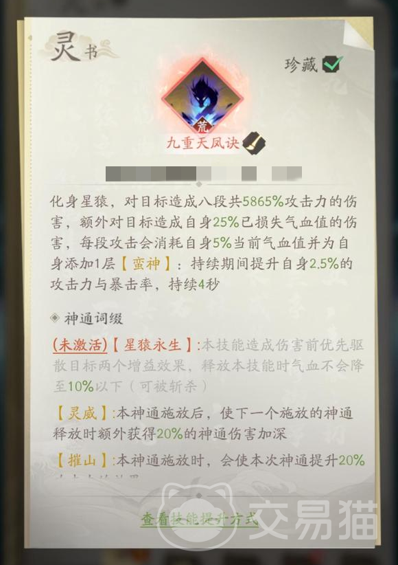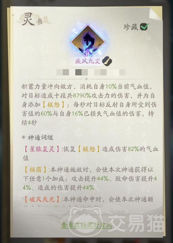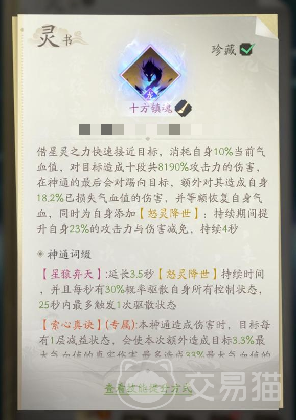 玄煞灵影诀,召唤星辰巨猿和自身对目标同时造成攻击,自身能获得怒意滔天效果,每秒损失一定量的生命值,对目标进行伤害反射。疾风九变需要积蓄力量冲向敌方,以消耗血量为代价,造成十段伤害自身,获得极怒,对伤害输出来源进行反射。最后是十方镇魂,快速接近目标,消耗血量对目标造成伤害,此技能在使用之后还有回血的效果,在持续期间还能提高攻击力加成和伤害减免。